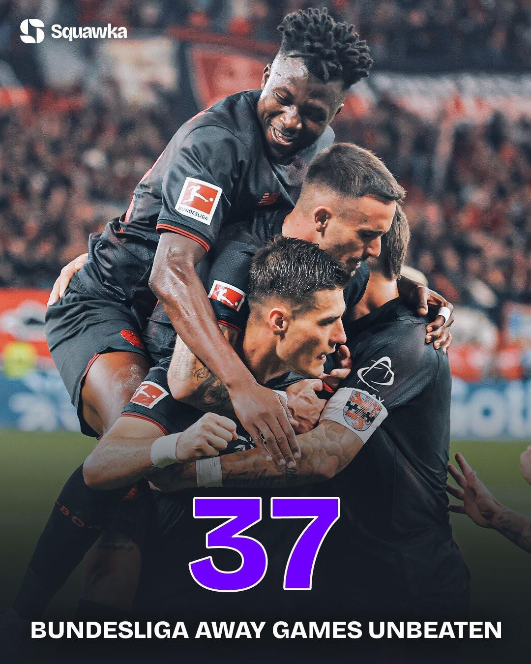 赛后,根据权威足球数据统计机构Squawka的统计,勒沃库森在德甲联赛中已经保持了37场客场比赛不败的惊人纪录。这一成绩在欧洲五大联赛的历史上,足以跻身前三。