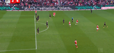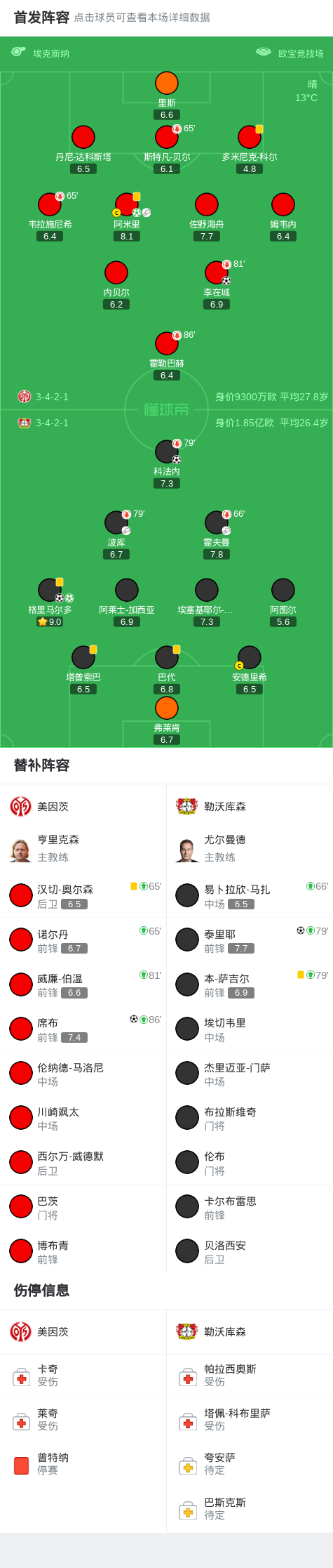 易边再战,美因茨加强攻势。第70分钟,姆韦内制造点球,阿米里主罚命中,美因茨将比分追至2-3。第88分钟,勒沃库森替补登场的泰里耶禁区推射破门,再度拉开比分至4-2。比赛尾声阶段,阿米里送出关键助攻,席布禁区小角度推射破门,美因茨将比分定格为3-4,但最终未能逆转。