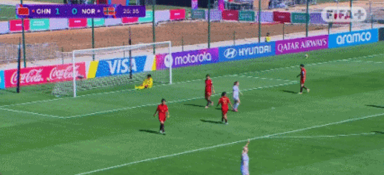 一球落后激发挪威队反扑,第26分钟,埃林森禁区外远射击中横梁弹出,险些扳平比分。但挪威球员很快因禁区内推人犯规被判点球,周欣怡主罚命中,比分扩大至2-0。