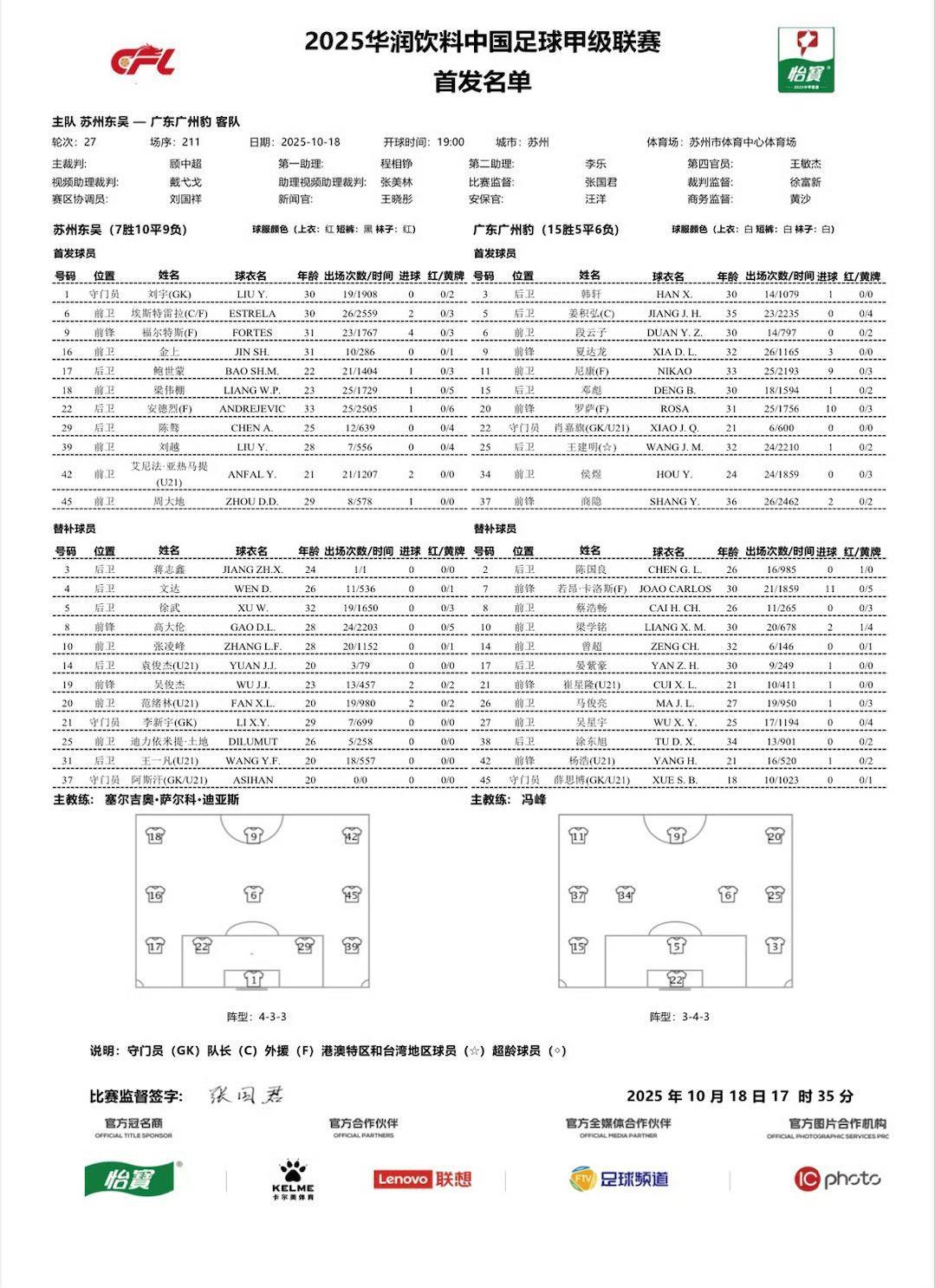 北京时间10月18日19:00,中甲联赛第27轮迎来一场焦点对决,苏州东吴坐镇主场迎战广东广州豹。本场比赛不仅关乎积分榜排名,更因双方外援配置的差异而备受关注——苏州东吴派出三名外援首发,而广东广州豹则以双外援阵容应对,夏达龙、商隐等核心球员悉数登场。
