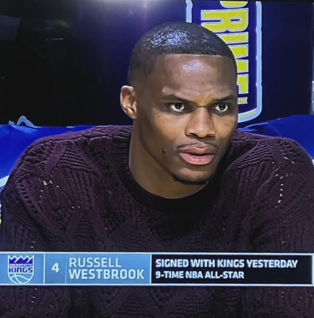 在加盟国王的首场比赛中,威少现场观战了新东家以117-116险胜老东家湖人的精彩对决。转播方对他的介绍也格外尊重,屏幕上赫然打出“9届全明星”的字样,彰显了他的辉煌成就。