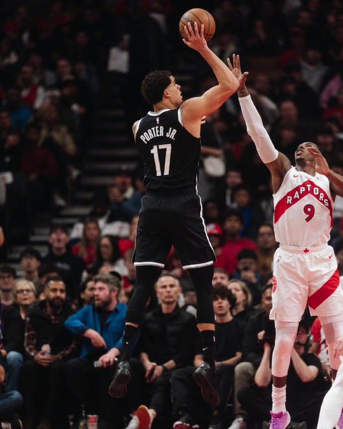 篮网方面,小迈克尔-波特火力全开,他出战33分钟,20投12中,三分11中6,罚球5中4,空砍34分10篮板3助攻的豪华数据,但也出现4次失误和5次犯规。上半场,小波特12投7中,三分5中3,罚球3中2,得到19分4篮板,一度帮助球队缩小分差。