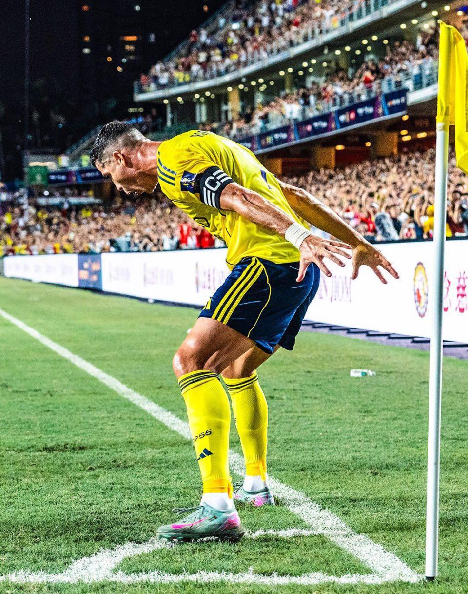 比赛伊始,利雅得胜利便全面压制对手。第14分钟,马内左路突进到底线,灵性倒三角回敲,菲利克斯迎球怒射,皮球划出完美弧线直挂死角,利雅得胜利1-0领先。进球后,菲利克斯不忘向偶像致敬,展示大腿肌肉,模仿C罗当年在皇马的标志性庆祝动作,全场球迷齐声高呼:“Siuuu!”