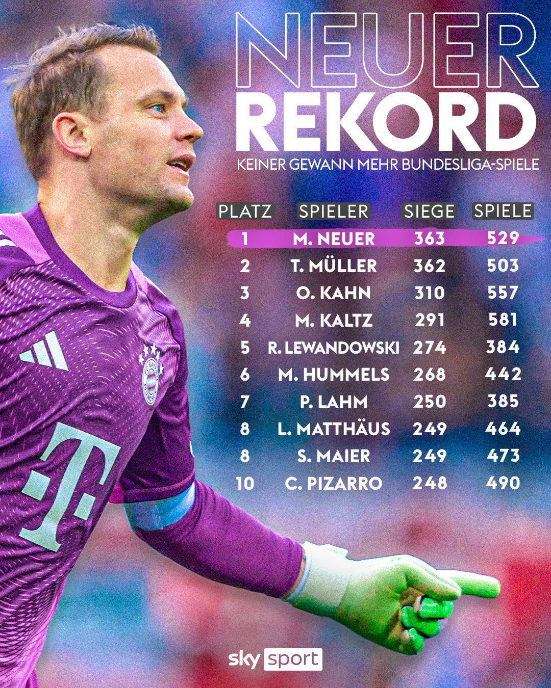 自2005年正式开启一线队职业生涯以来,诺伊尔先后代表沙尔克04和拜仁慕尼黑出战了529场德甲联赛,其中取得了363场胜利。这一数据不仅超越了老队友托马斯·穆勒(503场362胜)的纪录,更让他在德甲历史胜场排行榜上独占鳌头。诺伊尔的稳健表现和长期坚守,成为了他创造这一纪录的关键。