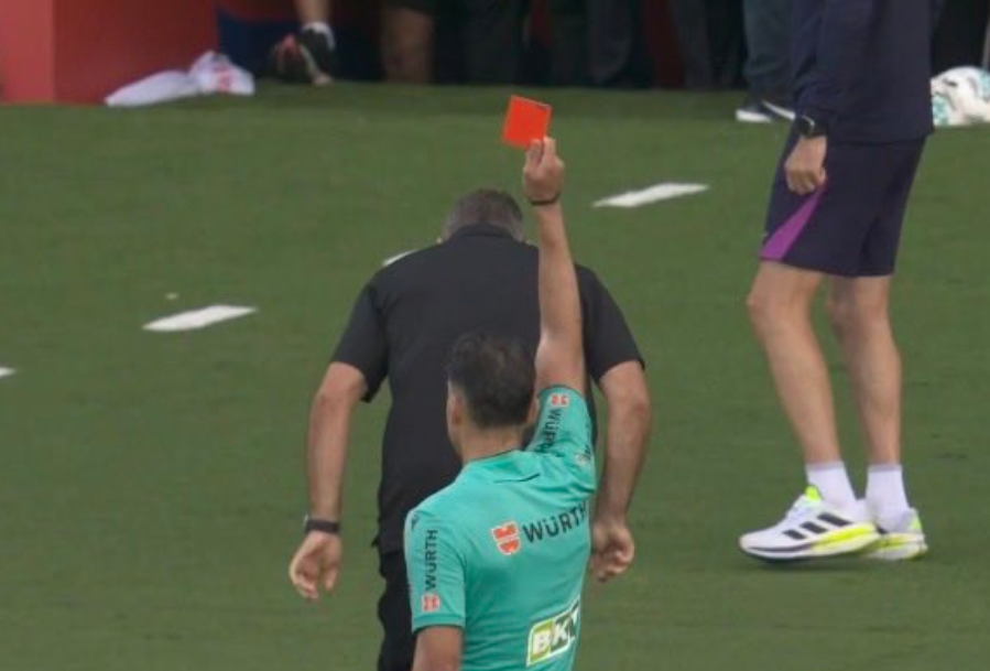 据现场转播画面显示,引发争议的判罚涉及一次球权归属问题。当值主裁判定球权归属赫罗纳后,弗里克情绪激动地冲向第四官员理论,因使用不当言语被出示第一张黄牌。随后他仍持续表达不满,主裁判果断出示第二张黄牌将其罚离教练区。