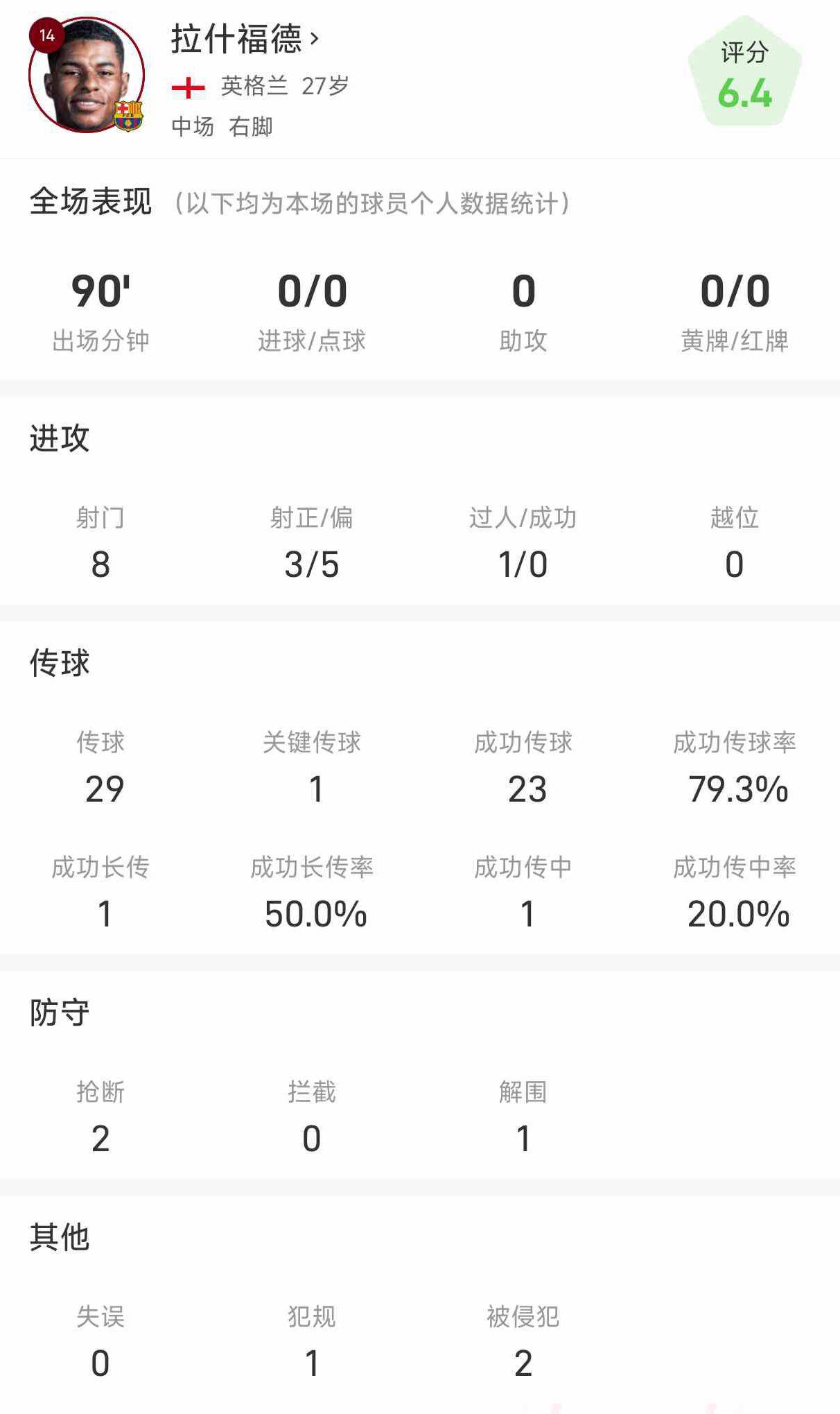 雷速体育10月19日讯 在本轮西甲联赛中,巴塞罗那主场以2-1的比分击败了赫罗纳。本场比赛中,备受关注的拉什福德打满了全场90分钟,但遗憾的是未能取得进球。