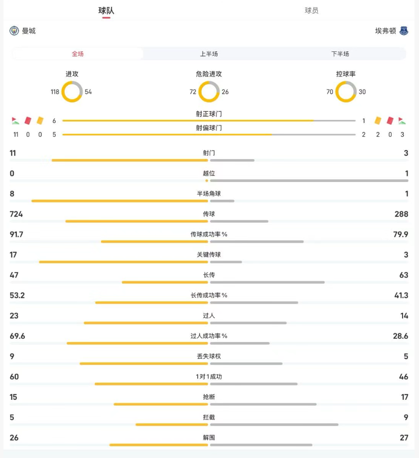 曼城vs埃弗顿全场主要数据一览: