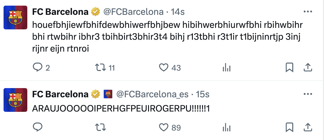 更令人忍俊不禁的是,在阿劳霍进球后,巴塞罗那足球俱乐部官方社交媒体账号接连发布两条由无意义字母组成的神秘字符串,如"ASDFGHJKL:POIUYTREWQ"等,这种打破常规的庆祝方式引发球迷热议。有网友调侃称:"看来官推小编激动到连键盘都敲碎了",也有球迷表示:"这种表达方式比千篇一律的文案更显真实"。