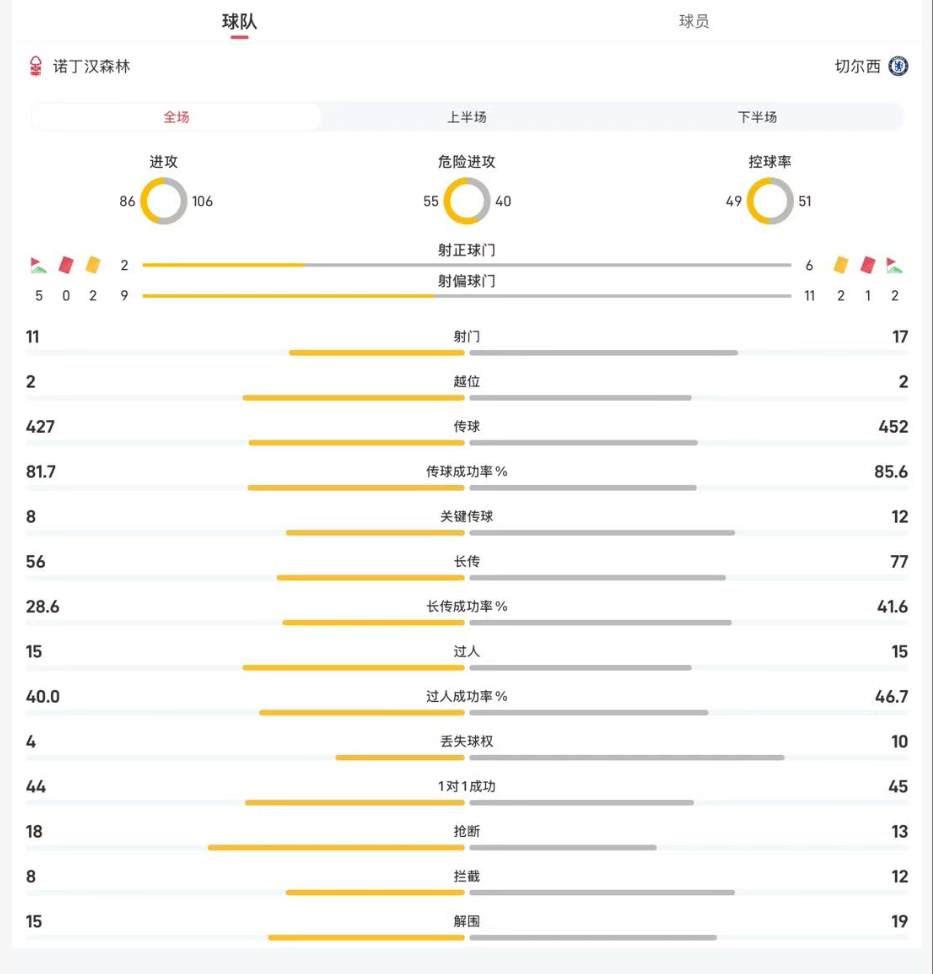 以下是诺丁汉森林与切尔西全场主要数据的对比: