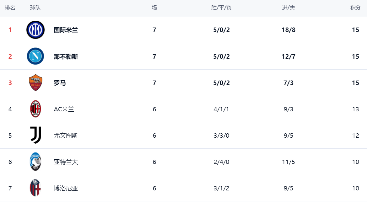 积分榜上,国际米兰以5胜2平积15分的战绩升至榜首,那不勒斯同样积15分但因净胜球劣势排名第二,罗马以15分4个净胜球位列第三。AC米兰13分排名第四,尤文图斯3胜3平保持不败积12分排名第五,亚特兰大2胜4平积10分排名第六,博洛尼亚与萨索洛同积10分分列第七、第八位。