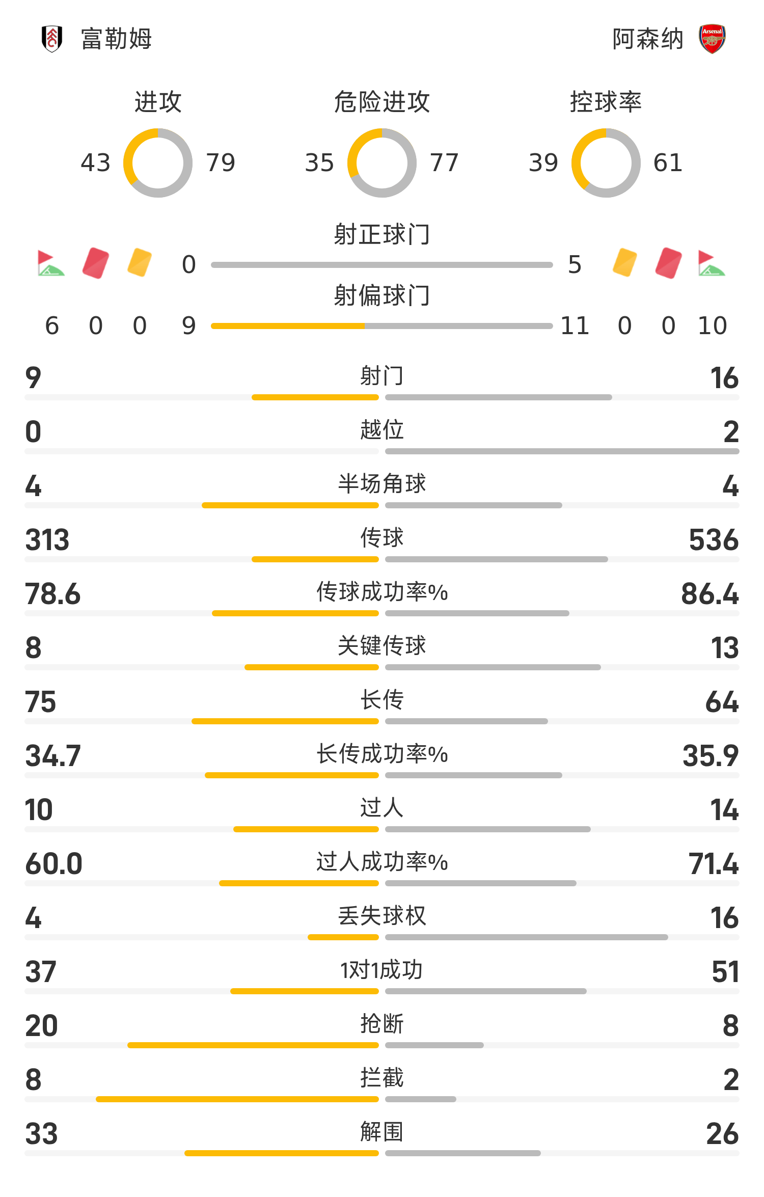 射门次数方面,阿森纳全场16次射门中有5次射正,并成功攻入1球,而富勒姆全场9次射门却无一射正,进攻效率低下。