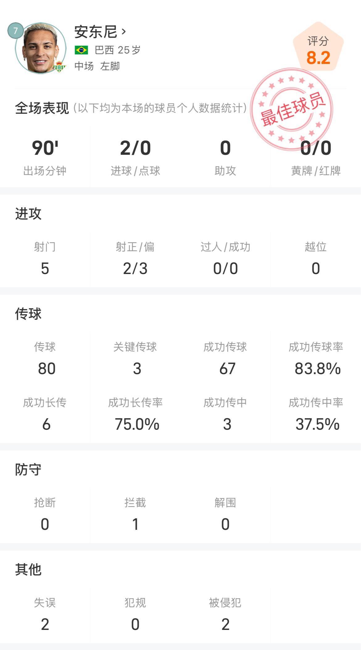 赛后,安东尼凭借着这场比赛的出色表现,获得了全场最高的评分。他的双响+绝平,不仅为皇家贝蒂斯带来了宝贵的分数,也让自己成为了球迷们热议的焦点。
