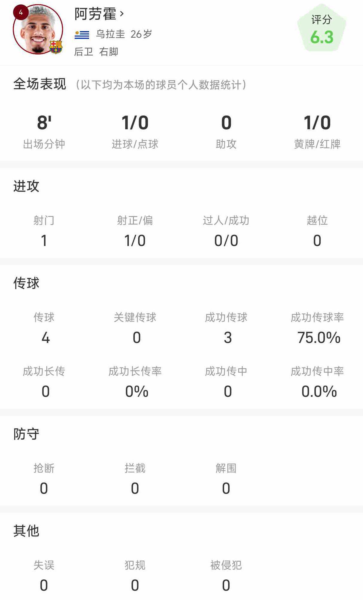 从数据统计来看,阿劳霍的这次替补登场堪称完美。他全场仅有1次射门机会,但正是这次射门让他收获了宝贵的进球。此外,他还完成了4次传球,其中3次成功,传球准确率高达75%。尽管上场时间有限,但阿劳霍用实际行动证明了自己的价值。