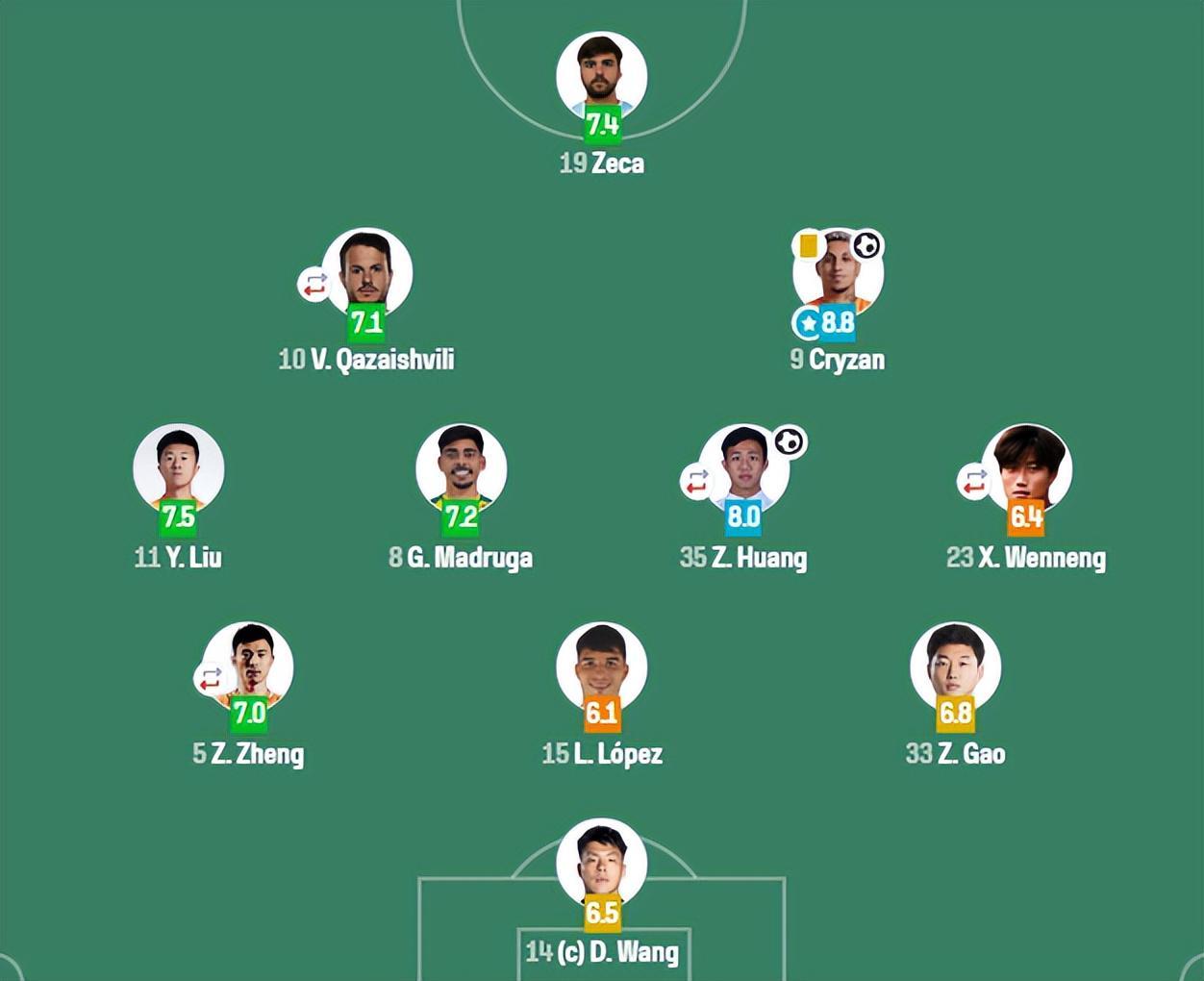 紧随克雷桑之后的是黄政宇,这位防守型中场在本场比赛中同样表现出色。他不仅两次射正球门,与克雷桑并列全场最高,传球成功率更是高达95%,3次长传均精准找到队友。在中后场,他3次解围和1次拦截,有效完成了防守任务。全场评分8.0分,成为泰山队内第二高分。此外,泰山队还有5名球员评分在7.0到8.0之间,分别是泽卡(7.4)、卡扎伊什维利(7.1)、刘洋(7.5)、马德鲁加(7.2)和郑铮(7.0)。