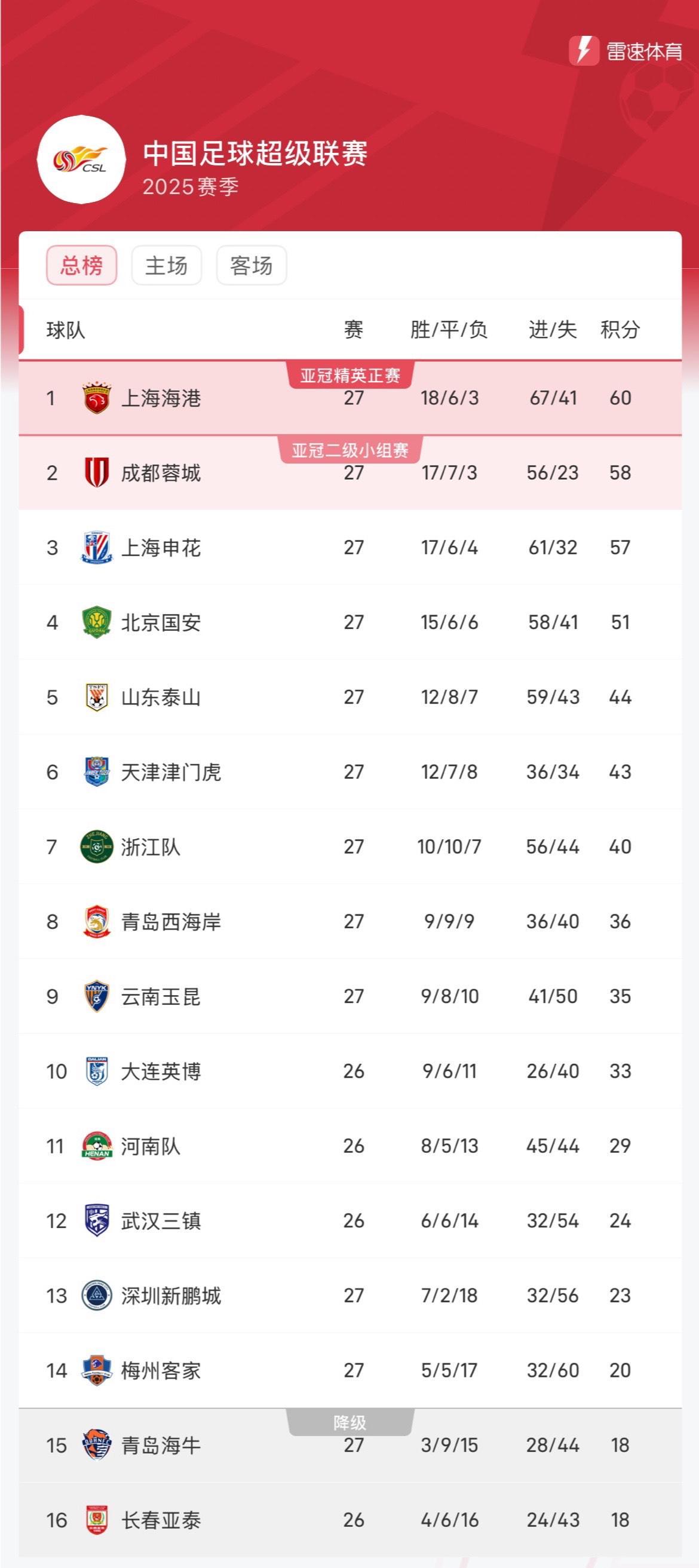 随着本轮比赛的结束,中超最新积分榜也随之出炉。上海海港队凭借出色的表现,以60分的积分稳居榜首,展现出强大的争冠实力。紧随其后的是成都蓉城队,他们以2分之差位列第二,而上海申花队则排在第三位,同样对冠军宝座虎视眈眈。相比之下,北京国安队则显得有些力不从心,他们目前落后榜首上海海港队多达9分,在联赛仅剩几轮的情况下,基本已经无缘争冠。