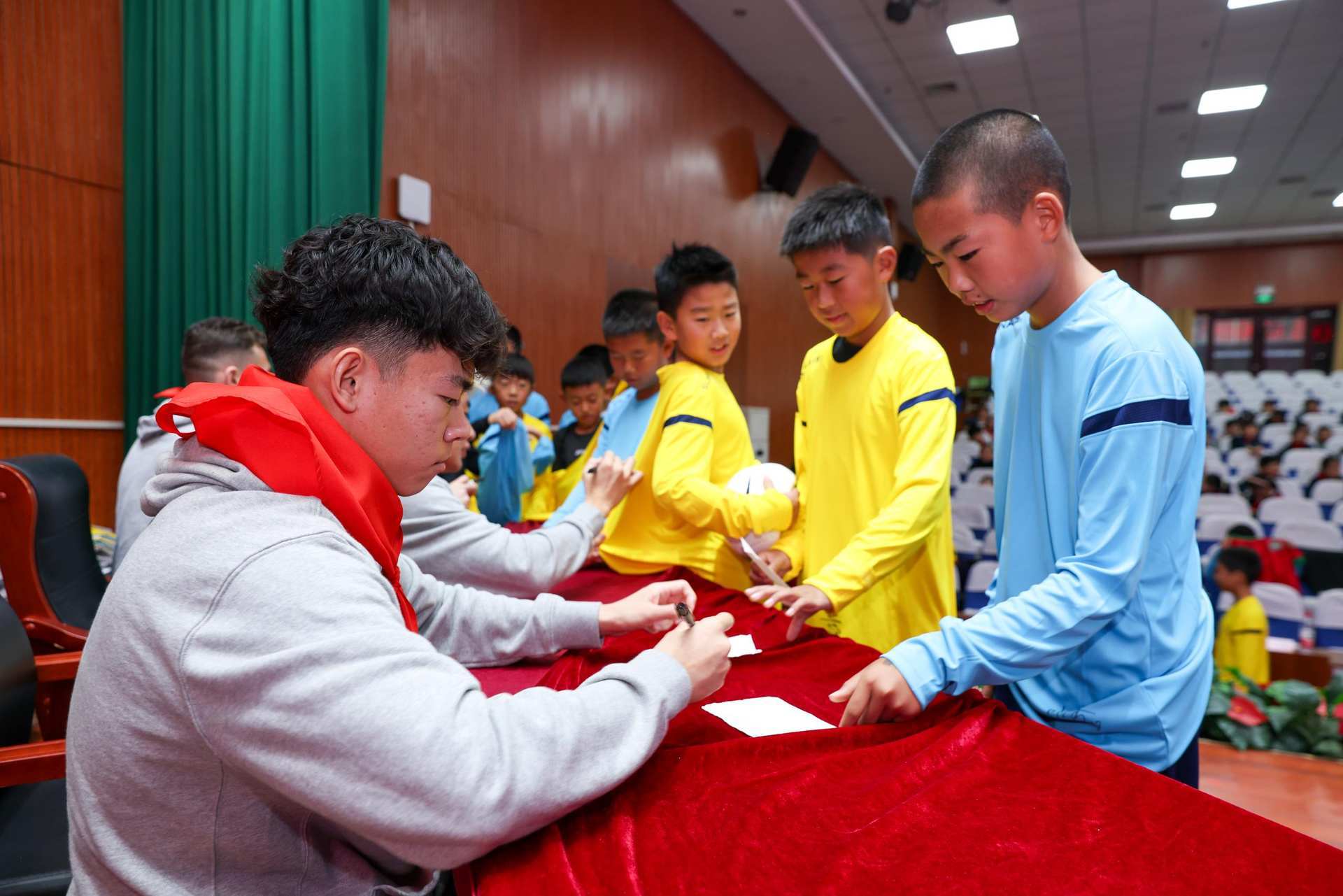 受天气影响,互动环节移至室内进行。河南足球俱乐部球员卢卡斯·马亚、刘易鑫、何小珂在主席台上接受小队员们的现场采访。本赛季成功晋级中国足协杯决赛的河南队,其球员成为孩子们心目中的英雄。小队员们提前准备了诸多问题,涵盖“铲球如何保持高成功率且不犯规”“哪些热身动作能避免受伤”等专业性内容。三位球员结合自身职业比赛经验,为孩子们提供了全面且实用的解答。
