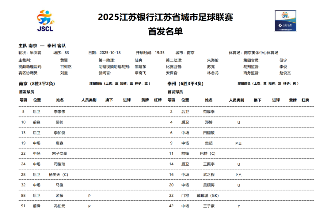 今晚19点35分,江苏省城市足球联赛首场半决赛在南京奥体中心打响,东道主南京队坐镇主场迎战来访的泰州队。这场焦点战吸引了超过5000名球迷到场观战,双方为争夺决赛席位展开激烈角逐。
