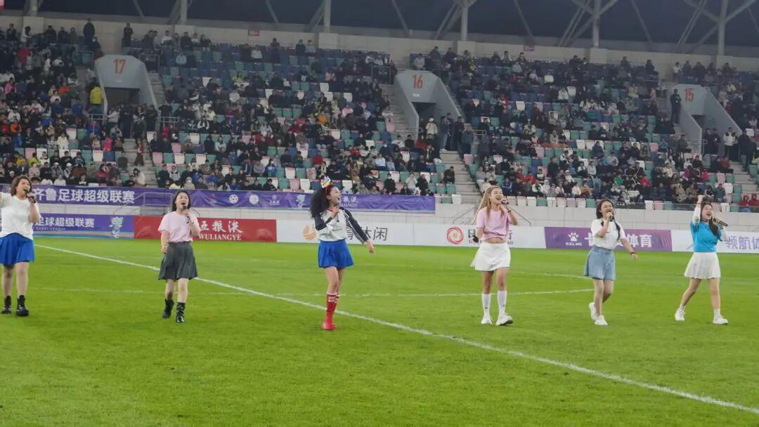 开场前,山东外国语职业技术大学外籍师生合唱团带来的《日照海天》令人耳目一新,从中感受到他们对日照的热爱。而日照文旅轻骑兵·拾光众唱团带来的动感十足的《踏浪》更是让绿茵场再掀波澜。
