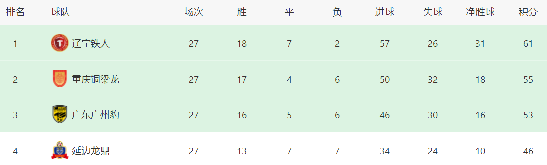 在积分榜上,辽宁铁人以18胜7平2负的战绩拿到61分,继续高居榜首,与冠军奖杯的距离越来越近。重庆铜梁龙则以55分紧随其后,落后辽宁铁人6分,排名第2。广东广州豹以53分位列第3,与重庆铜梁龙仅有2分之差。延边龙鼎以46分排名第4,石家庄功夫则以44分位列第5。南通支云和定南赣联同积40分,分别排名第6和第7。
