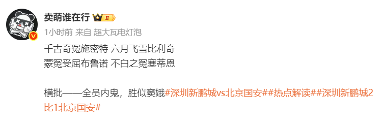 记者丰臻在个人社媒上这样写道:“死亡赛程第一场直接赢了,最悲观的深圳突然最乐观了。深圳新鹏城是一支神奇的球队,去年只干了一件事,平申花。今年只干了两件事,赢申花赢国安。但是国安比新鹏城更神奇八千倍。”