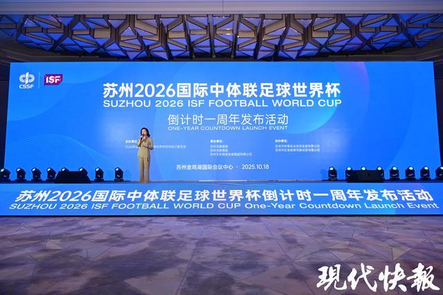 现代快报讯(记者 徐晓安)10月18日,苏州2026国际中体联足球世界杯倒计时一周年发布活动在金鸡湖会议中心隆重举行。这一标志性时刻意味着赛事筹备工作正式进入冲刺阶段,全球目光聚焦苏州,共同期待这场青春与足球的盛会。
