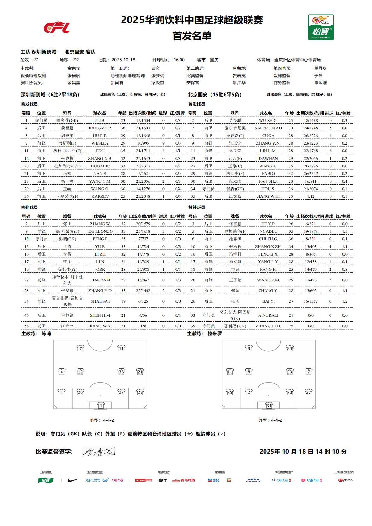 本场比赛对于双方来说都至关重要,不仅关乎保级和争冠的走势,更是一场心理与战术的双重较量。在巨大的压力下,双方赛前都做出了主教练的调整,深圳新鹏城由前国脚陈涛接过教鞭,而北京国安则由拉米罗接替塞蒂恩,执掌球队帅印。