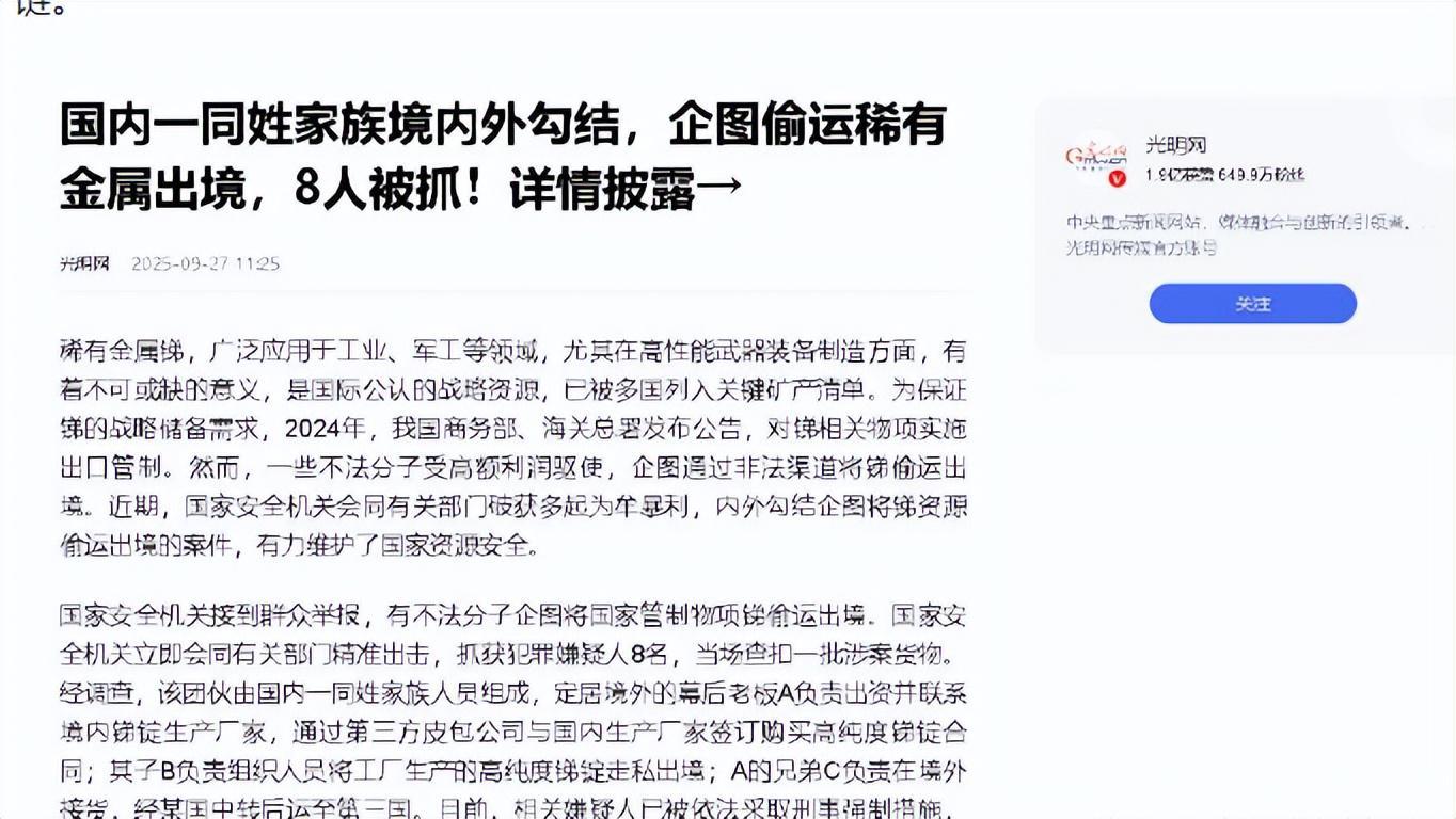 国安部披露:父子兄弟齐上阵,企图将金属锑偷运出境,8名犯罪嫌疑人被抓获---2025-09-27---观察者网