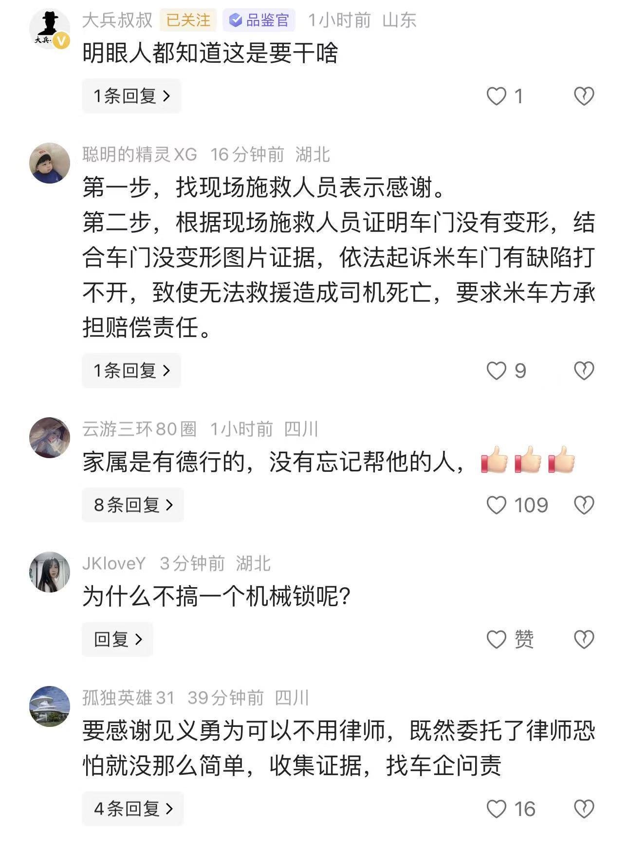 当然,网友们也支持家属去维权。他们认为,小米方面应该对这起事件给出回应。至少,小米应该表态,说明后续是否会对车门进行改进,以便在车辆发生碰撞时,车门更容易被打开,为车内的乘客和司机提供更多的救援机会。