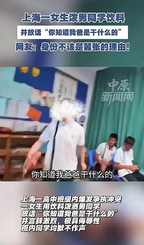 “知道我爸是谁吗?”这句嚣张的话语,最近在网络上引起了轩然大波。一名上海女高中生在教室里,将手中的饮料狠狠泼向了男同学,同时还不忘辱骂对方,并炫耀自己父亲的身份,态度极其嚣张。