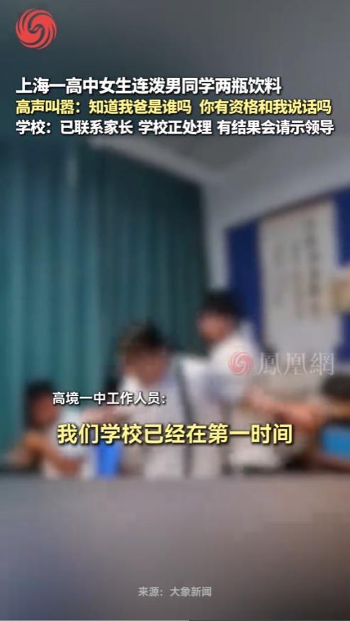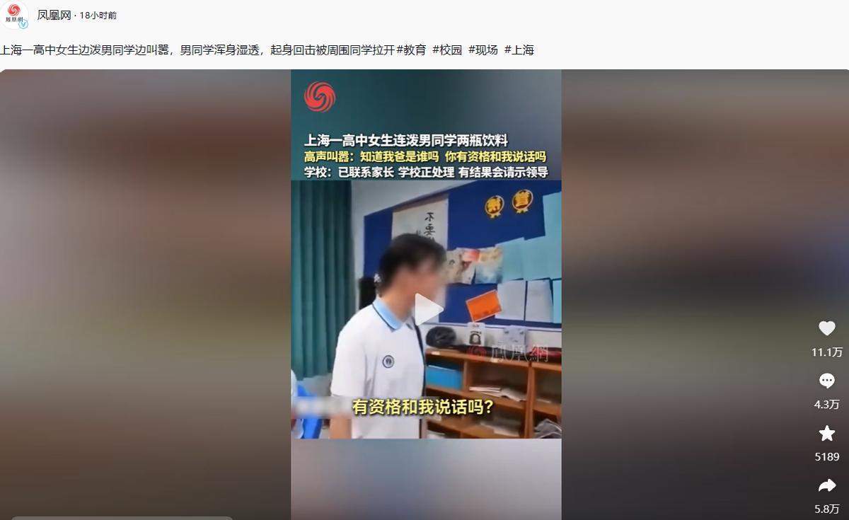 凤凰网《上海一高中女生边泼男同学边叫嚣,男同学浑身湿透,起身回击被周围同学拉开#教育 #校园 #现场 #上海》