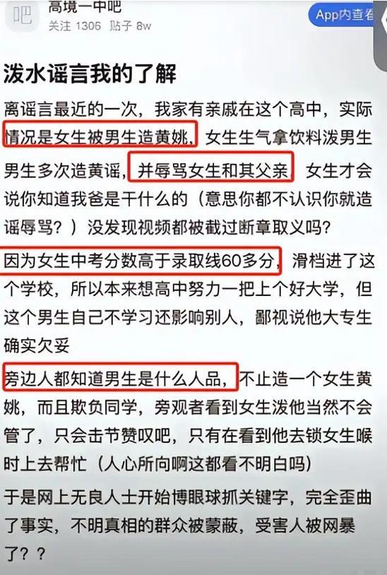 就在大家针对女生家庭情况讨论得如火如荼的时候,一个网友突然在女生所在高中的贴吧里发布了一个帖子。根据这位不知名的网友所说,视频中的女生之所以会泼男生饮料,是因为在学校的时候,这名男生总是肆意辱骂女生,甚至还给女生造黄谣,辱骂女生的父亲。