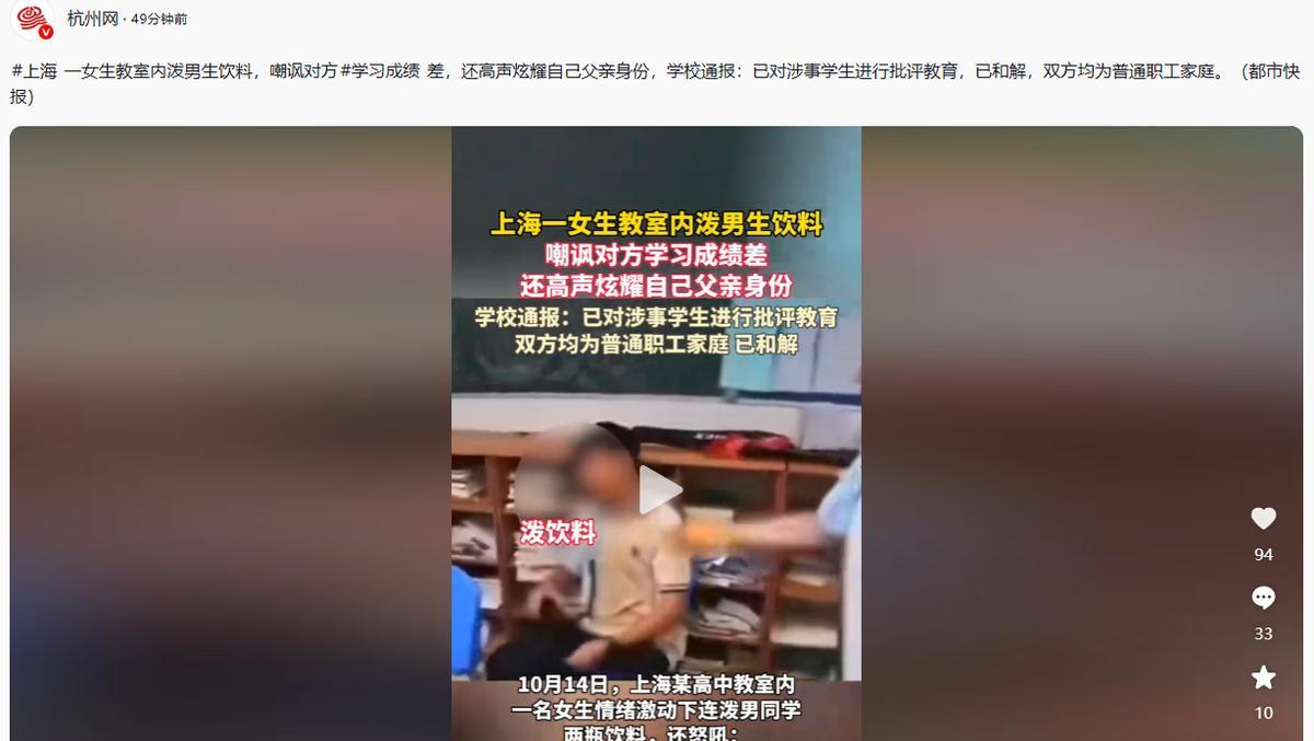 杭州网《#上海 一女生教室内泼男生饮料,嘲讽对方#学习成绩 差,还高声炫耀自己父亲身份,学校通报:已对涉事学生进行批评教育,已和解,双方均为普通职工家庭。(都市快报)》