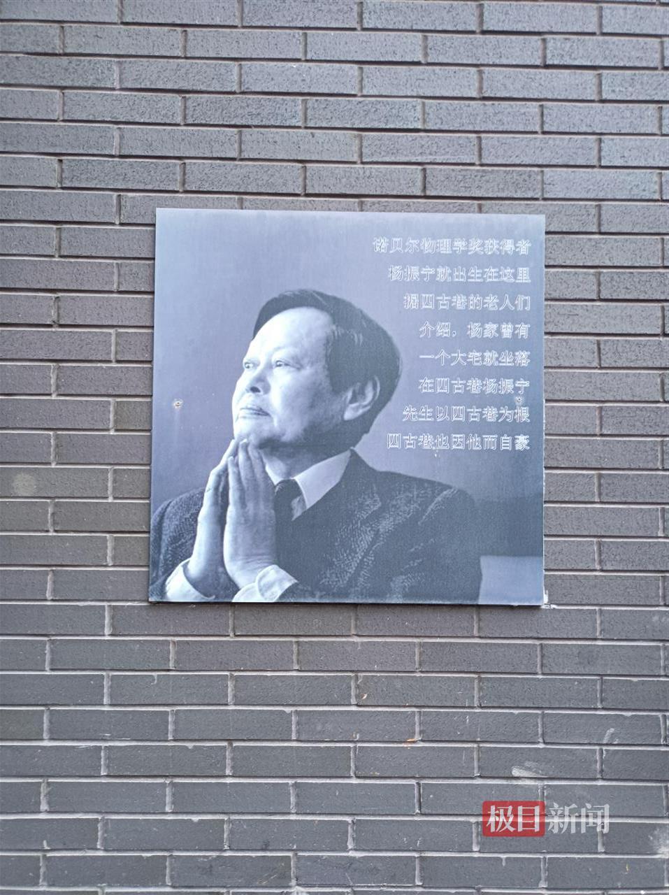 记者发现,小区院墙已改造成文化墙,上面挂有多幅杨振宁的照片,包括十个月大的杨振宁与父母在故居外的合影、杨振宁与家人的合影,以及他与邓稼先的合影。文化墙特意悬挂了一张杨振宁的肖像照,配文写道:“先生以四古巷为根,四古巷也因他而自豪。”