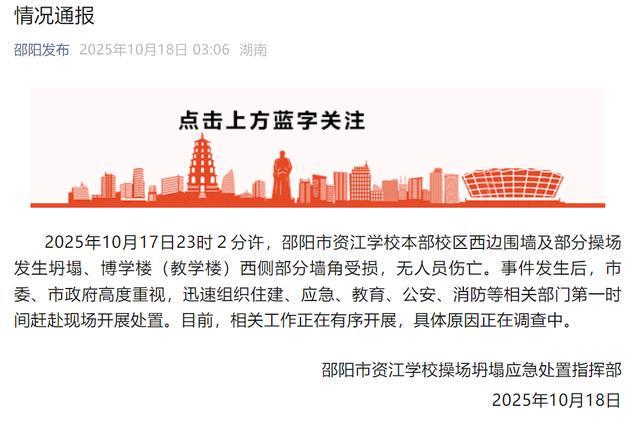 10月18日凌晨3点,邵阳市资江学校操场坍塌应急处置指挥部通过“邵阳发布”通报称,10月17日23时2分许,邵阳市资江学校本部校区西边围墙及部分操场发生坍塌、博学楼(教学楼)西侧部分墙角受损,无人员伤亡。