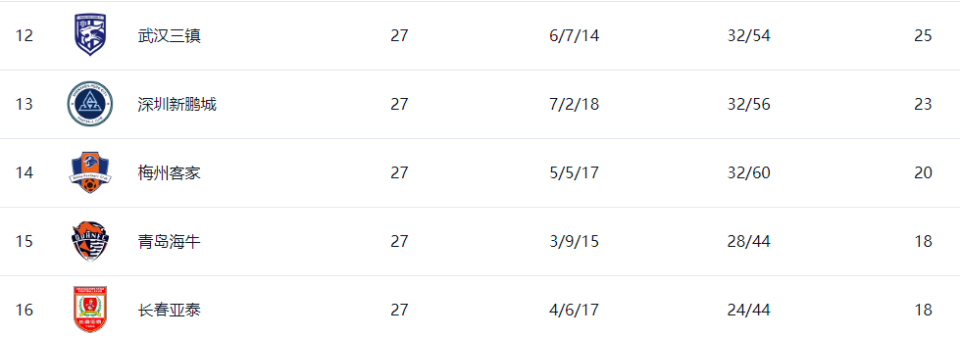 27轮战罢,积分榜呈现新格局:深圳新鹏城以23分升至第13位,梅州客家20分排第14位,青岛海牛与长春亚泰同积18分分列第15、16位。最后三轮赛事中,亚泰将面临两客一主的魔鬼赛程,对手包括津门虎、北京国安和青岛西海岸;青岛海牛同样两客一主,需对阵北京国安、青岛西海岸和武汉三镇。