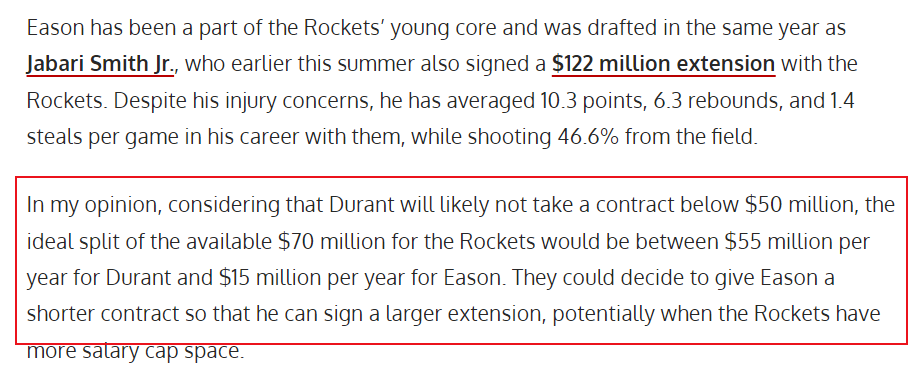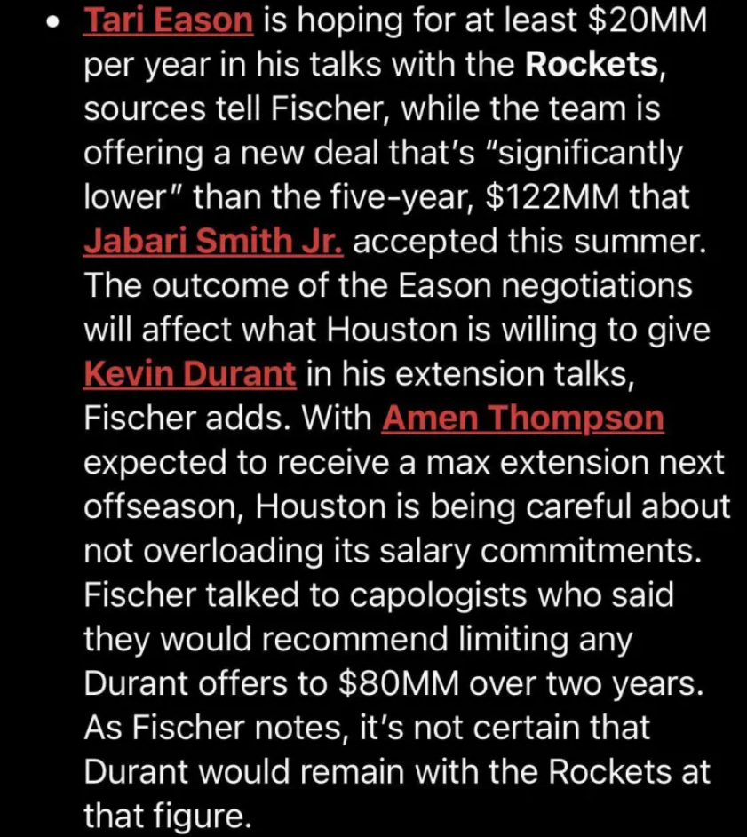 文霍斯特指出,火箭管理层并未向杜兰特提供两年1.22亿美元的顶薪续约合同,否则双方早已达成协议。考虑到范弗利特(Fred VanVleet)已确定执行下赛季2500万美元的球员选项,火箭当前剩余约7000万美元薪资空间需同时用于杜兰特和伊森的续约谈判。更复杂的是,球队还需为明夏阿门·汤普森(Amen Thompson)的顶薪续约预留空间。