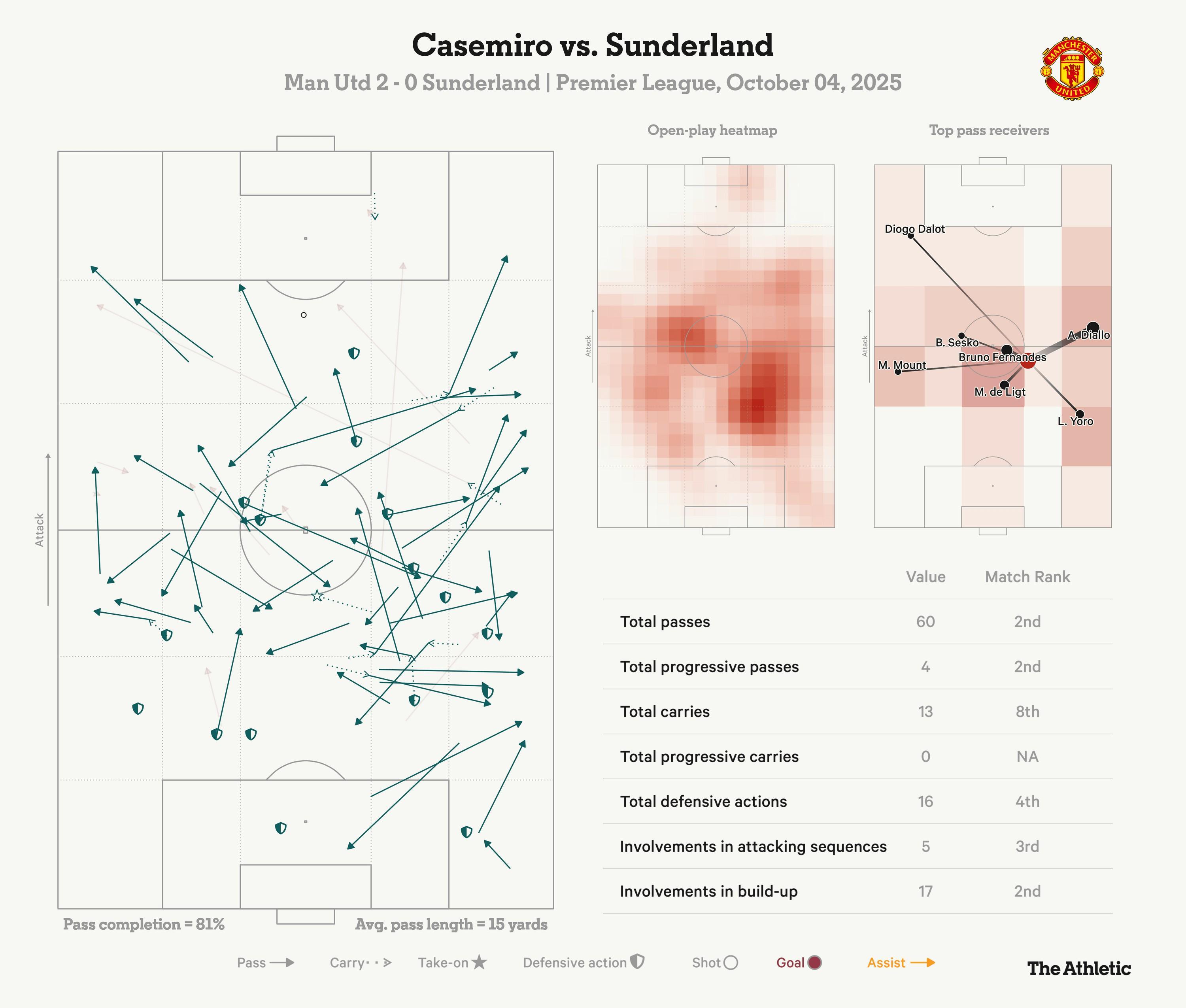 国际比赛日前,曼联2-0击败桑德兰,这场胜利缓解了阿莫林的帅位压力。卡塞米罗在本场比赛中的表现进一步凸显了他在球队中的重要性。尽管司职防守型中场,但他在本场比赛中参与了5次进攻配合,这一数据在曼联队内排名第三,且他在球队的进攻组织阶段发挥了关键作用。
