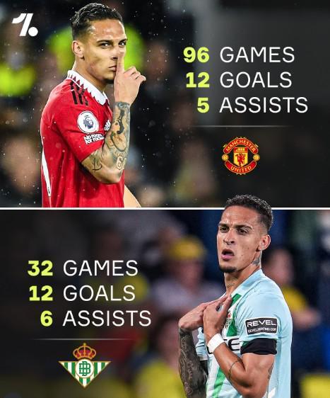 回顾安东尼在曼联的时光,他共为红魔出场96次,贡献了12粒进球和5次助攻,直接参与了17粒进球。虽然这样的数据对于一名前锋来说已经相当不错,但与他在皇家贝蒂斯的表现相比,还是略显逊色。