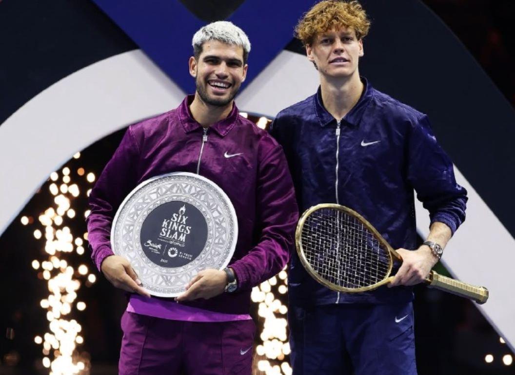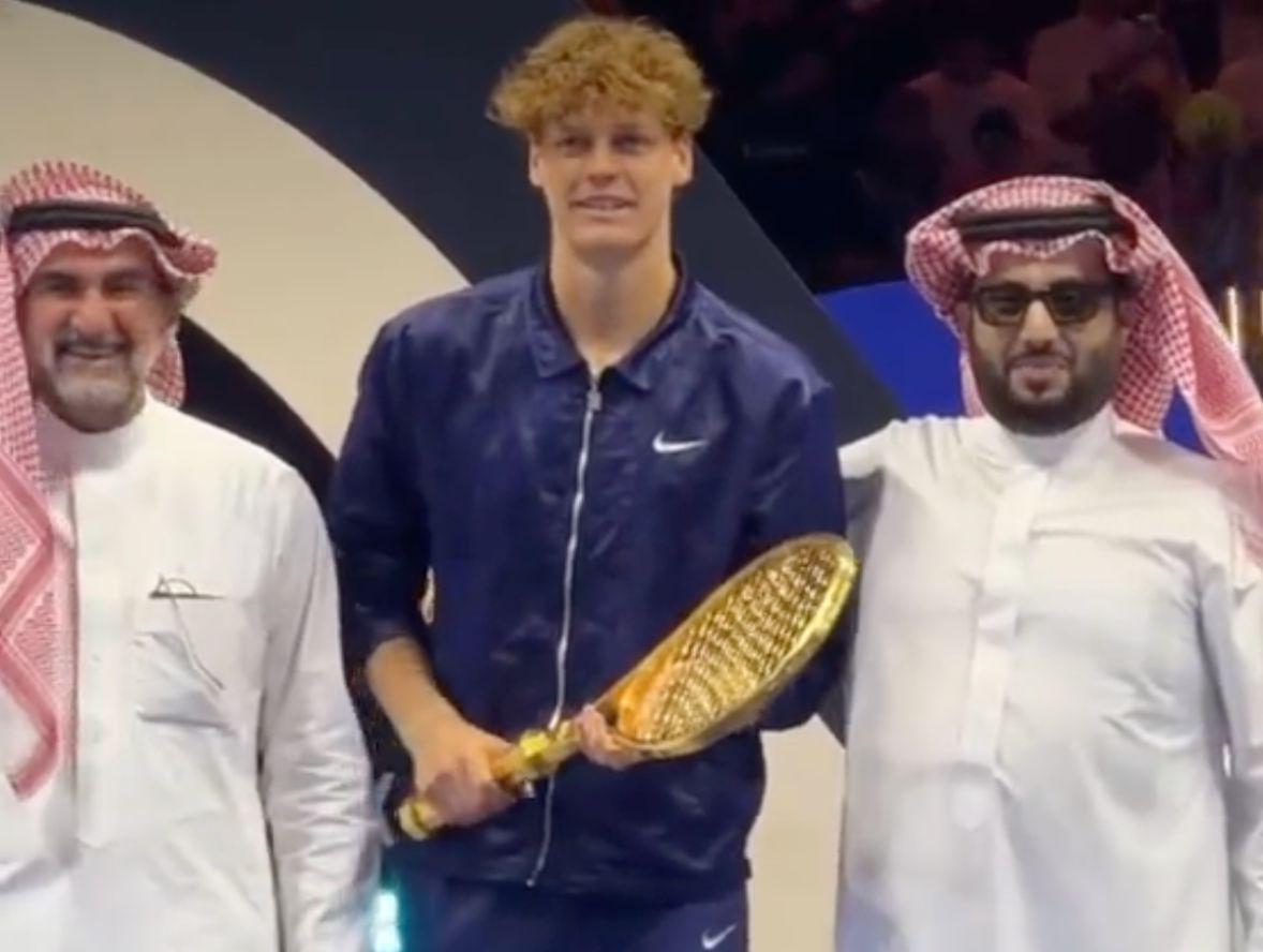 在颁奖现场,主持人拿到这把网球拍后,不禁直呼:“超级重(very heavy)。”而站在一旁的辛纳则笑得合不拢嘴,显然对这份特殊的礼物非常满意。值得一提的是,去年沙特方面也曾给纳达尔送过同样的一把纯金网球拍,看来沙特土豪对网球巨星的慷慨馈赠已经成为了一种传统。