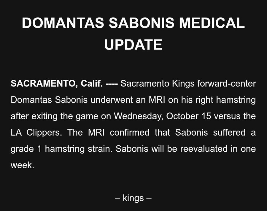 萨博尼斯的腿筋问题出现在季前赛对阵快船的比赛中,当时他因伤提前离场。在随后的季前赛收官战中,他因接受进一步检查而缺席。尽管被诊断为一级拉伤(相对轻微),但萨博尼斯的复出时间仍需谨慎。根据球队安排,他最早可能在10月27日对阵湖人队的比赛中回归。