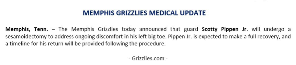 灰熊队官方宣布,后卫小斯科蒂-皮蓬因左脚大脚趾受伤将接受籽骨切除术,预计将缺阵12周。据消息人士透露,小皮蓬的伤病源于“持续不适”,手术旨在彻底解决问题。