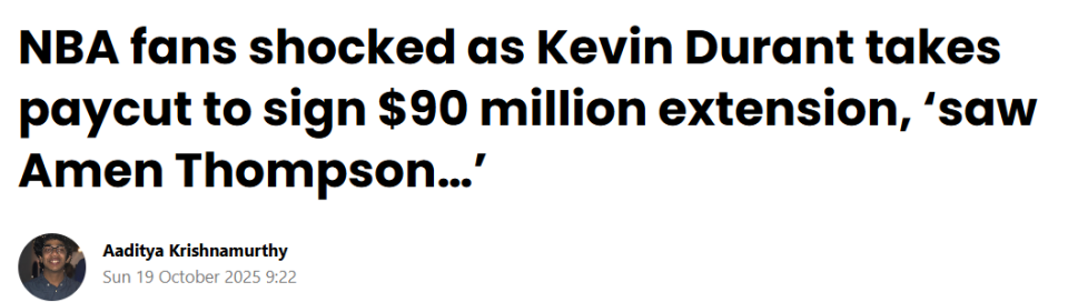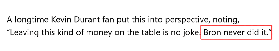 不过,也有球迷对杜兰特的降薪提出了不同的看法。一位球迷提醒大家注意杜兰特的年龄,他补充说:“杜兰特在他39岁的赛季锁定了4500万美元的保障薪水……我不确定这是否能被称为无私的牺牲。但无论如何,他的决定都值得尊重。”