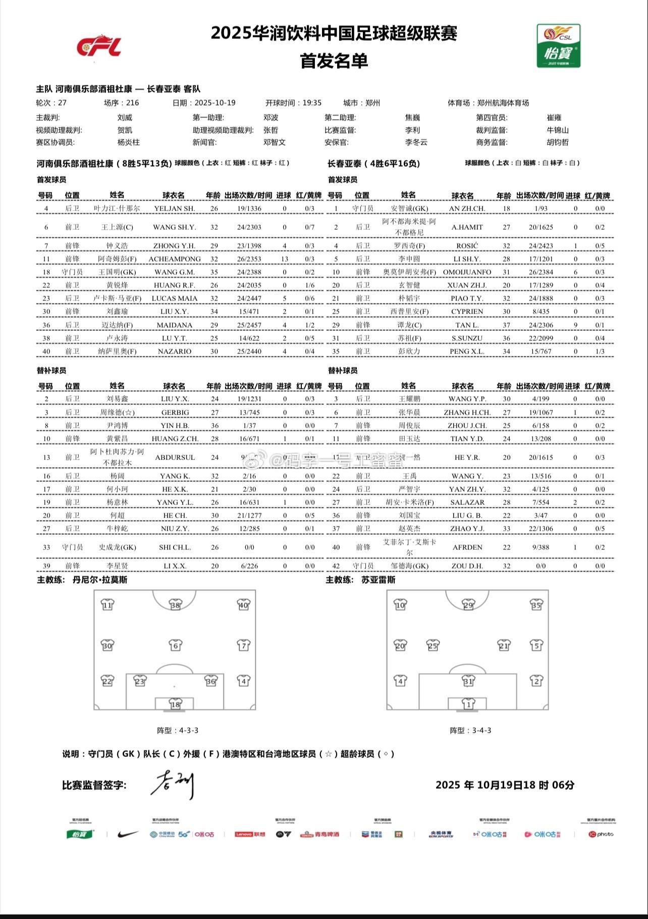 北京时间10月19日19:35,中超联赛第27轮迎来一场焦点对决,河南队坐镇主场迎战长春亚泰。赛前双方公布了首发阵容,两队均派出四名外援出战,核心球员王上源、卢永涛、谭龙等悉数登场。