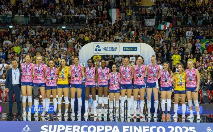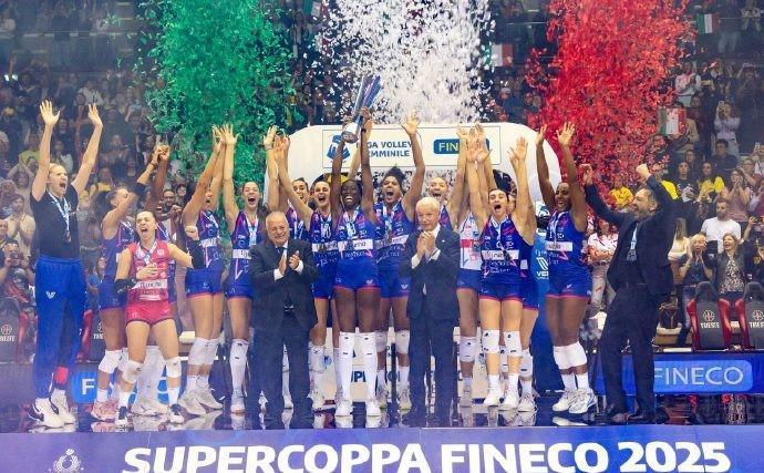 北京时间10月18日,2025年意大利女排超级杯决赛上演巅峰对决,米兰女排以3-2(18-25、25-22、25-20、13-25、15-12)的总比分力克卫冕冠军科内利亚诺,终结对手自2019年以来的国内赛事统治,首次捧起超级杯冠军奖杯。