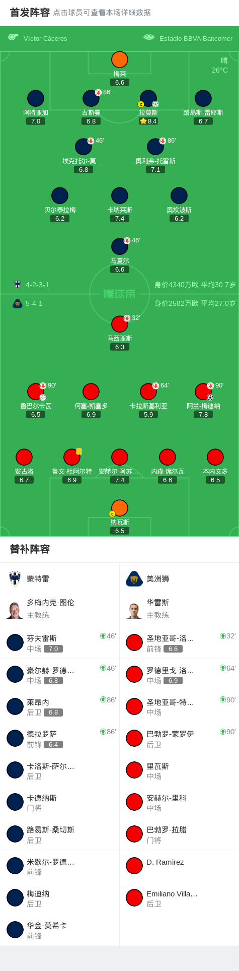 然而,蒙特雷并未因此气馁。上半场补时第9分钟,主队获得关键点球机会。球员拉莫斯顶住压力,稳稳将球罚入球门右下角,成功将比分扳平为1-1。这一进球不仅展现了拉莫斯的个人能力,也极大鼓舞了蒙特雷全队的士气。
