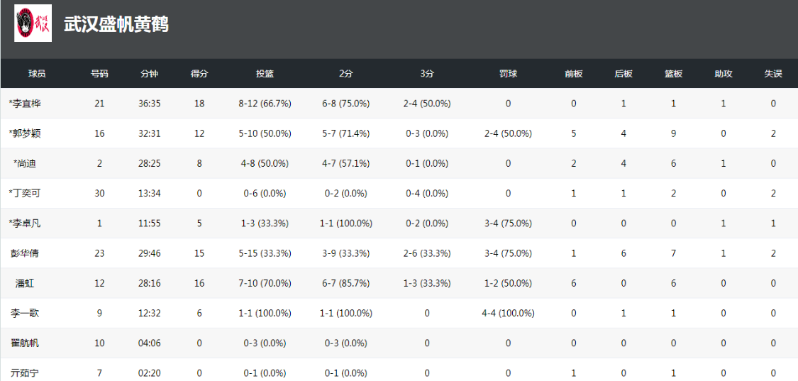 武汉女篮全场10人登场7人得分,其中有多达4人得分上双。李宜桦以12中8的高效表现得到全场最高的18分,外加潘虹16分6篮板(全部都是进攻篮板),彭华倩15分7篮板,郭梦颖12分9篮板,共同为球队的胜利贡献了力量。