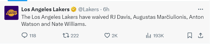 在裁掉这4人后,湖人队的大名单重新调整为14名正式合同球员与3名双向合同球员: