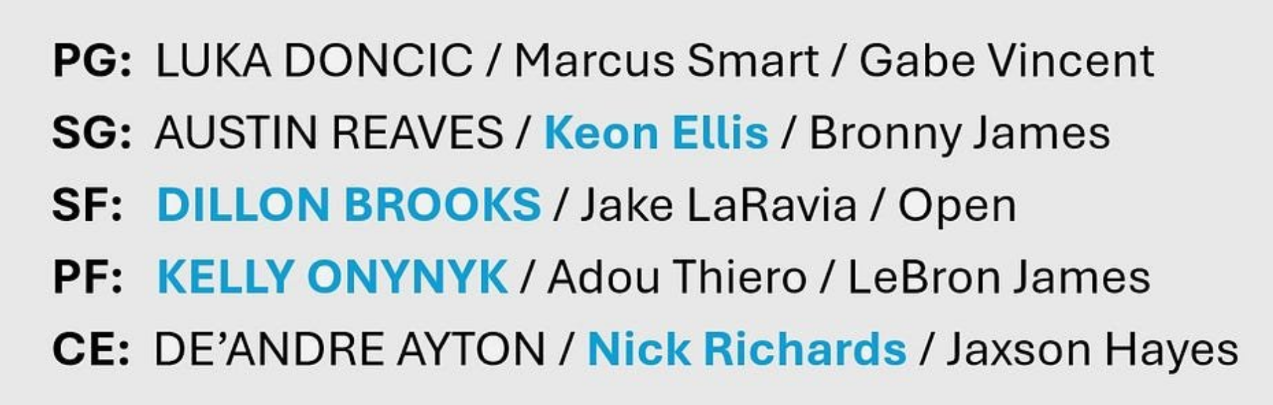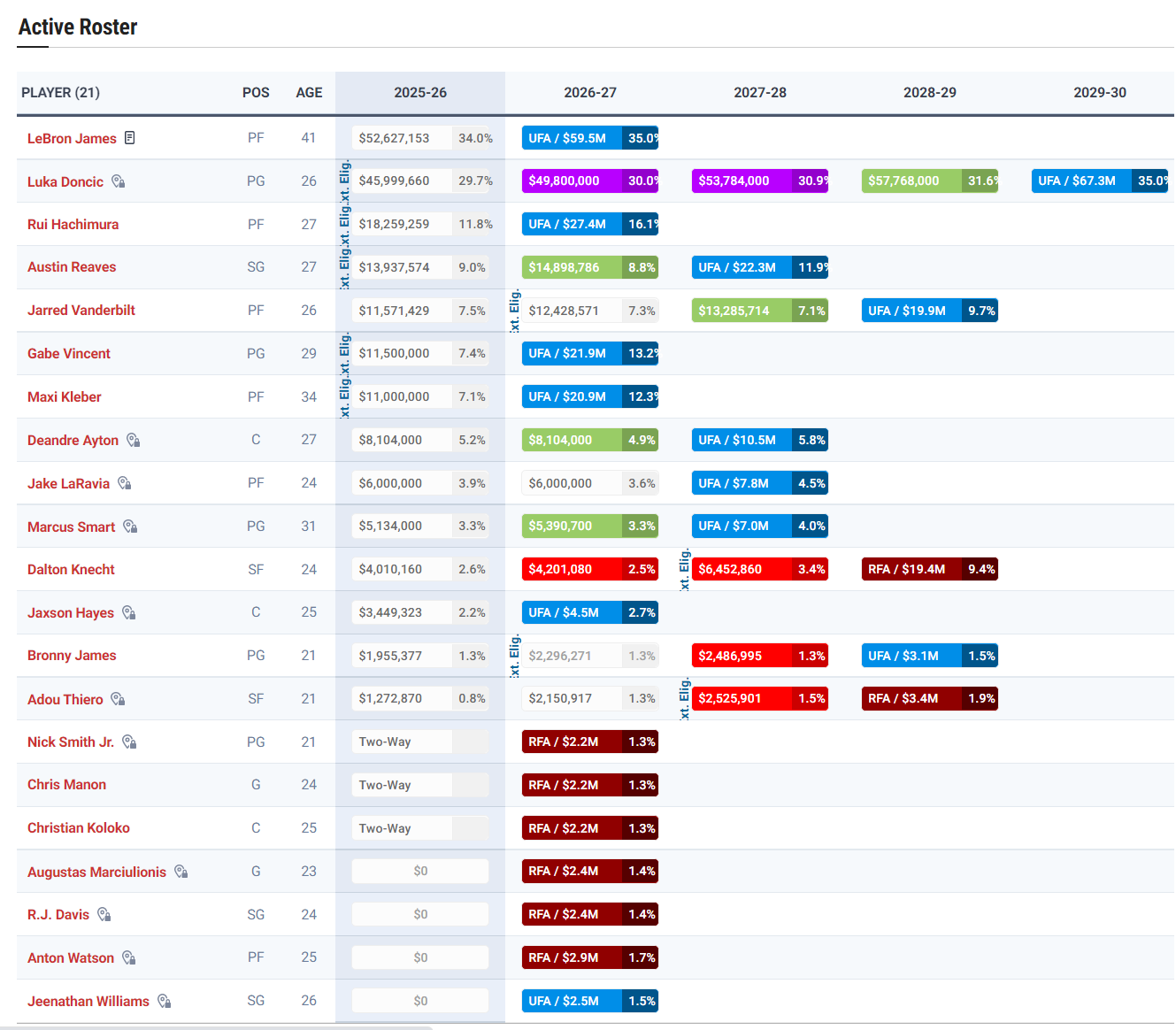 正式合同球员:詹姆斯、东契奇、八村垒、里夫斯、范德比尔特、文森特、克勒贝尔、艾顿、拉拉维亚、斯马特、克内克特、海斯、布朗尼、蒂耶罗;