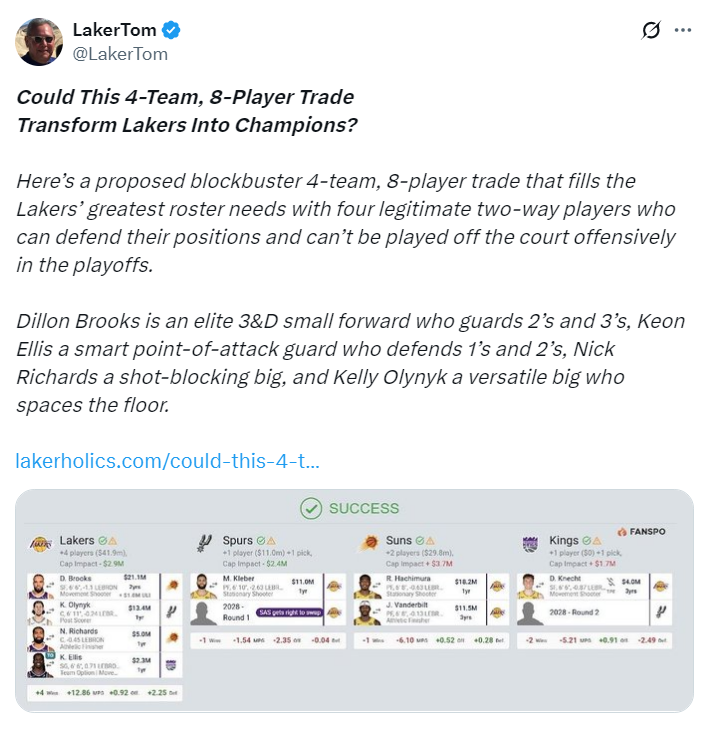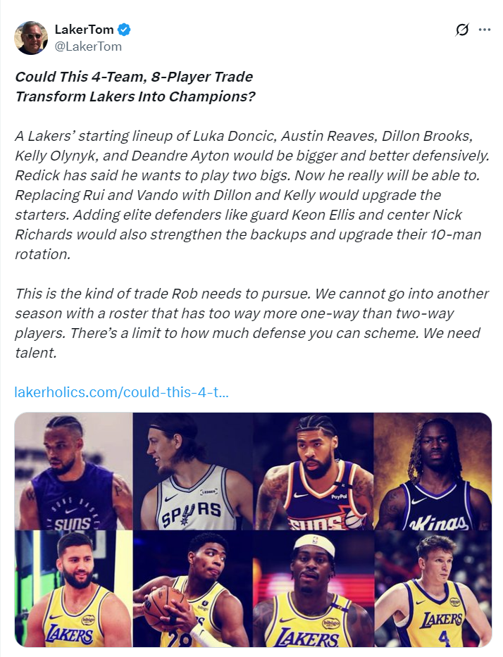 尽管湖人队阵容已初步成型,但湖人媒体Laker Tom却认为这套14+3名单仍不足以争夺总冠军。他建议湖人队通过一笔四方交易进一步提升防守与阵容深度,并指出狄龙、理查兹、埃利斯等球员是理想补强目标。