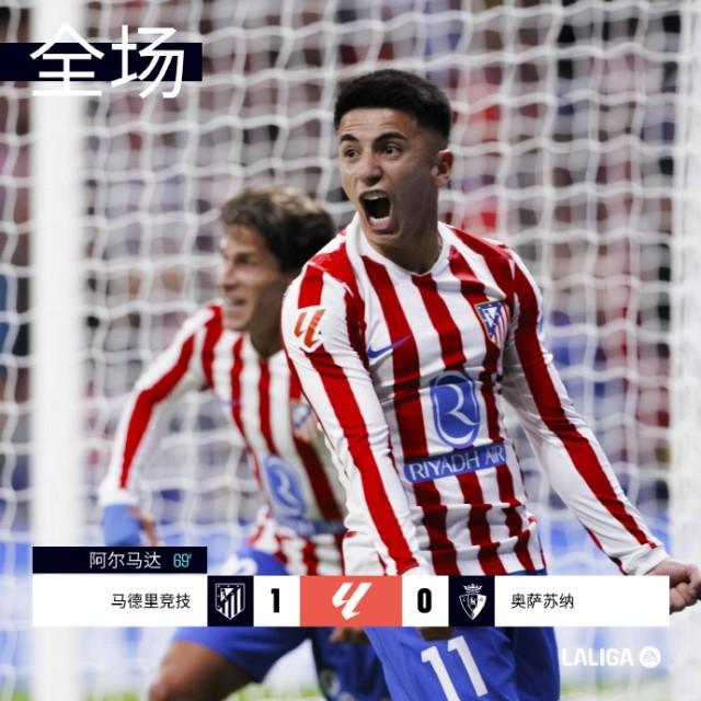 在刚刚结束的西甲第9轮一场焦点战中,马德里竞技坐镇主场以1比0的比分力克奥萨苏纳,凭借这场胜利,马竞的排名成功攀升至积分榜第四位。本场比赛,替补登场的阿尔马达成为了球队的英雄,他的一锤定音帮助马竞全取三分。